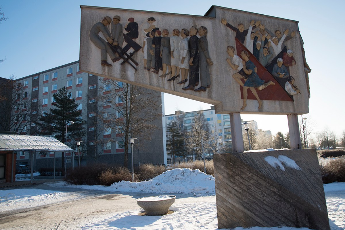 Piipahdin viime kuussa Porissa. Sampolan lähiöön tullessa ei voi olla huomaamatta erikoista monumenttia. Keramiikkareliefi on kuvanveistäjä Kerttu Horilan ensimmäinen, vuonna 1981 valmistunut julkinen teos, ja toteutettiin tilaustyönä. Neuvostoliitto ja sosialistinen realismi tulevat vahvasti mieleen, ja olisi kiinnostavaa tietää työn taustoista. Horila tunnetaan erityisesti luonnollisen kokoisista ihmisveistoksista, jotka usein yllättävät arkisen elämän paikoissa. Katso www.kerttuhorila.fi.