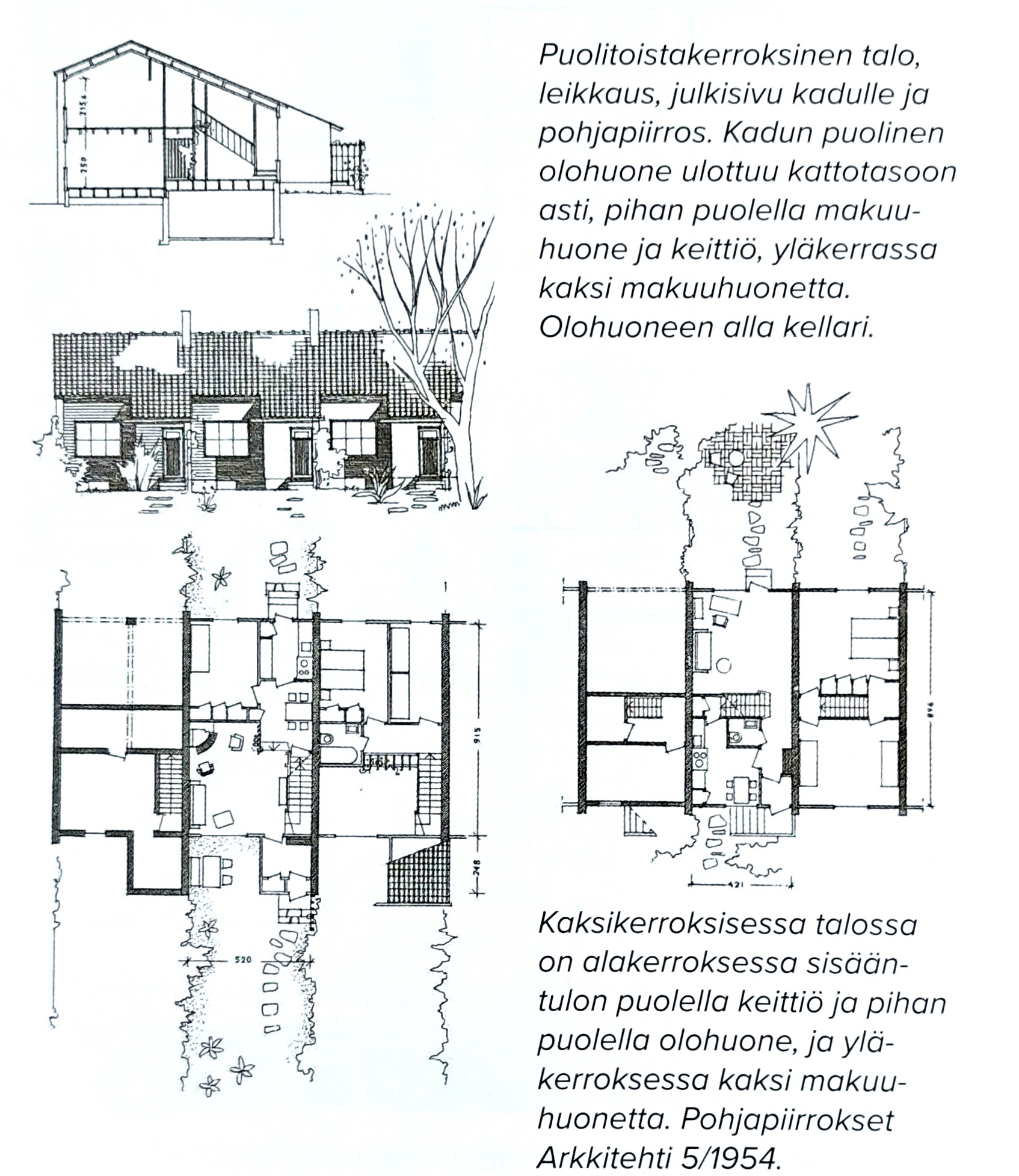 Kuvituksesta merkittävä osa on pohjaratkaisuja erilaisista asunto- ja rakennustyypeistä. Moni ehkä mieltää aravatuotannon liittyvän kerrostaloihin, mutta Arava rahoitti yhtä lailla omakotitaloja. Arava olikin mukana myös tyyppitalojen kehittelyssä.