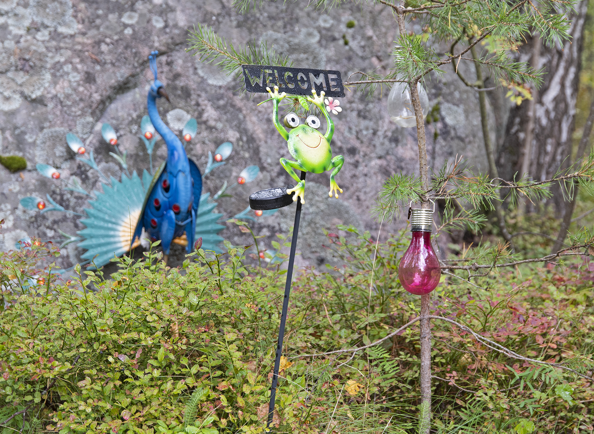 Toisessa purettavaksi suunitellussa korttelissa sammakko toivottaa tervetuloa riikinkukon seuratessa sivummalla.
