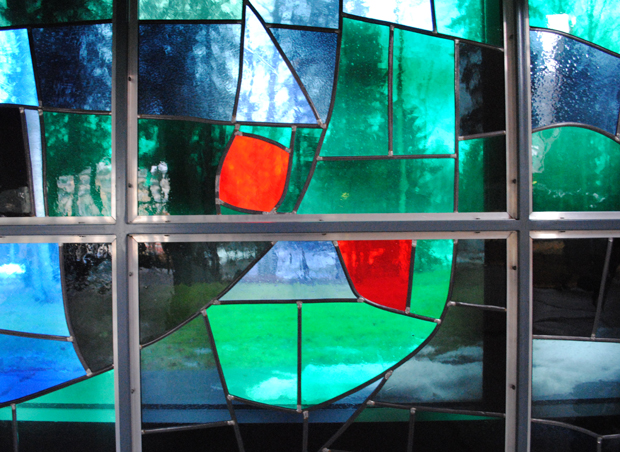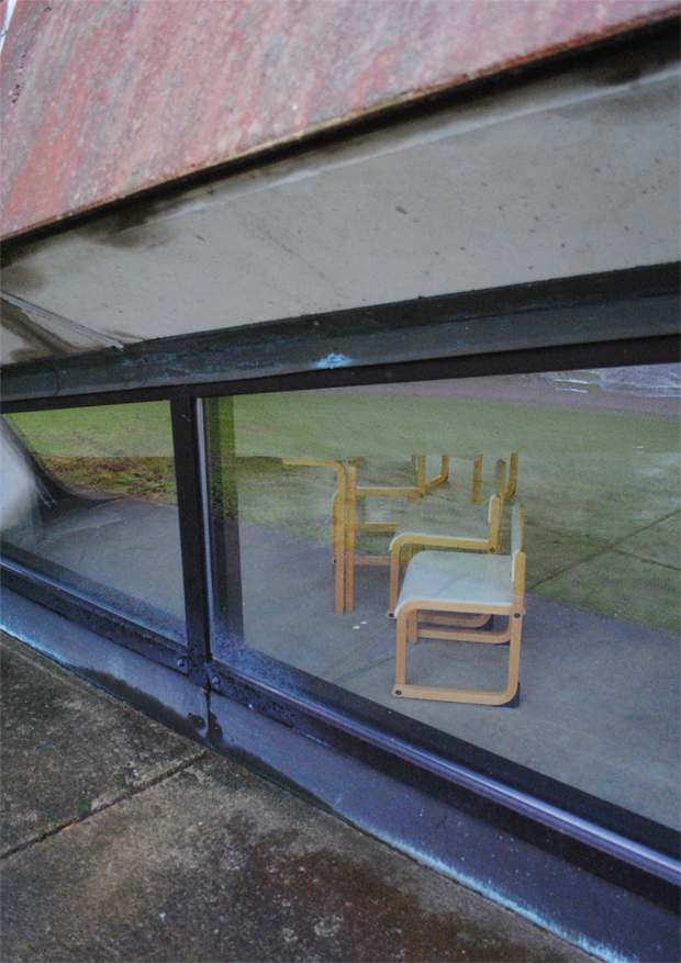 Yksityiskohdat paljastuvat saavuttaessa lähemmäksi. Sisäänkäynnin kohdalla väriä on runsaasti: punaisen metallin ja lasin konstruktio toivottaa vieraan tervetulleeksi.
