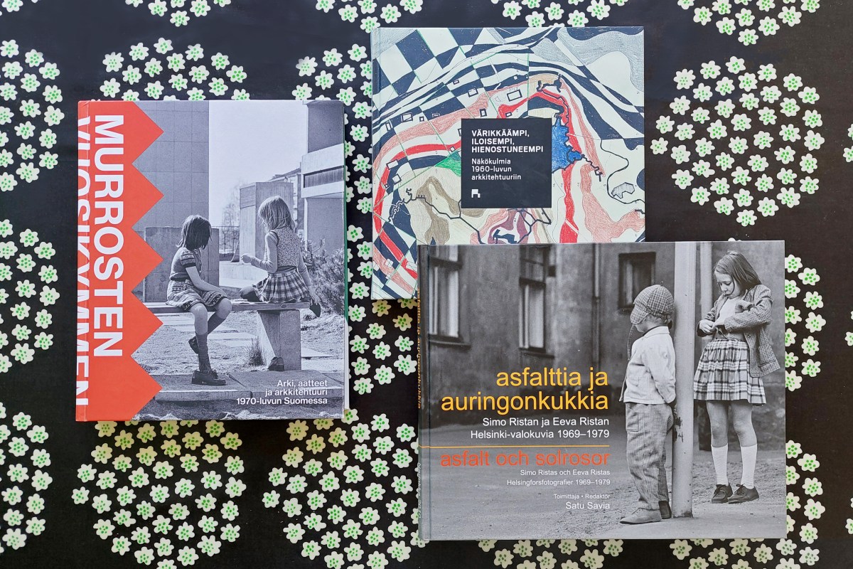 Tästä siirrymmekin luontevasti 1970-luvulle, mutta pysymme yhä Arkkitehtuurimuseon julkaisuissa. Murrosten vuosikymmen. Arki, aatteet ja arkkitehtuuri 1970-luvun Suomessa liittyi niinikään vuosikymmenteemaiseen näyttelyyn, joka järjestettiin viime vuonna (2023). Hieno kokonaisuus esittelee esimerkiksi 1970-luvun rentoa kotityyliä, lähiöiden muutosta, matkailun arkkitehtuuria, purkuvimmaa ja ympäristöasioihin heräämistä. Painava teos jättää mieleeni vain yhden kysymyksen: Onko suunnittelu 1980-luvun arkkitehtuurin näyttelystä jo käynnistynyt?