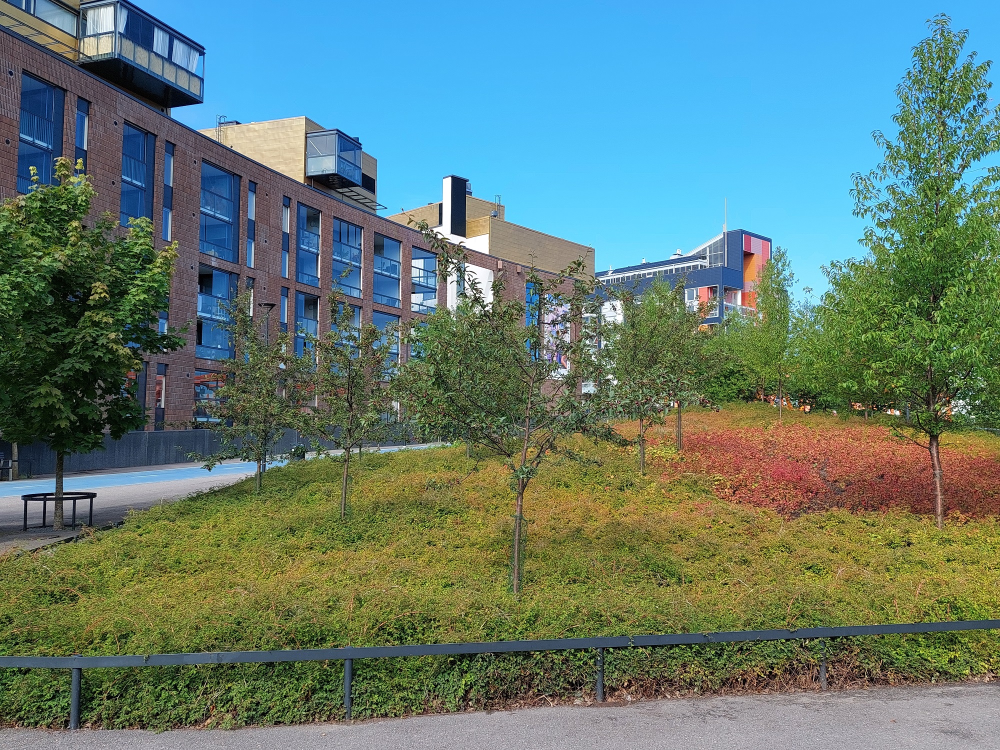 Totta on sekin, että vihreyttä on talojen välissä niukasti. Luonnollisesti puut ovat uusilla pihoilla vielä hentoja. Vehreys on suunnitellusti keskitetty alueen läpi mutkittelevalle puistovyöhykkeelle. Päämäärättömästi vaeltelevalle kulkijalle puisto tuntuu tulevan eteen tämän tästä, sillä se on todella iso. Aurinkoisena aamuna ei tunnu erityisen ahtaalta tai ankealta.