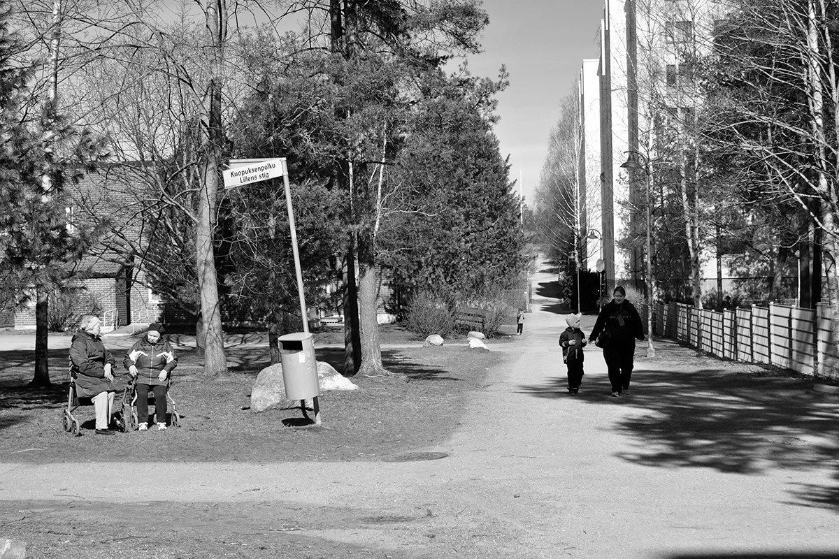 Tarkoituksenani oli haastatella kierrokselle osallistuneita heidän ottamien valokuvien avulla. Tältä osin tulos oli laiha, sillä vain pari kävelijää innostui myös valokuvaamaan. Tämänkin voi kääntää voitoksi: seuraavaksi päiväksi sovitussa keskustelutilaisuudessa aikaa oli käytettävissä runsaasti, ja aiheessa päästiin pintaa syvemmälle tunnemaisemaan. Laatu korvasi määrän. Niin minä kuin haastateltavanikin toivomme, että tätä periaatetta ei unohdeta nykyisten lähiöiden täydennysrakennussuunnitelmien kohdalla.
